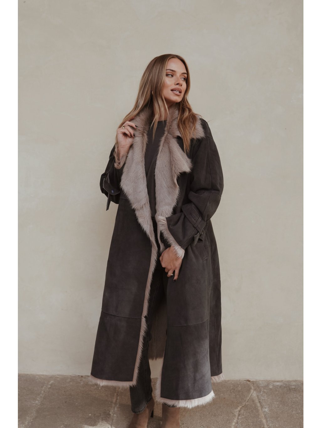 Luxusní dlouhý kabát z pravé jehněčí košešiny (Real Dyed Shearling - Lamb Fur)