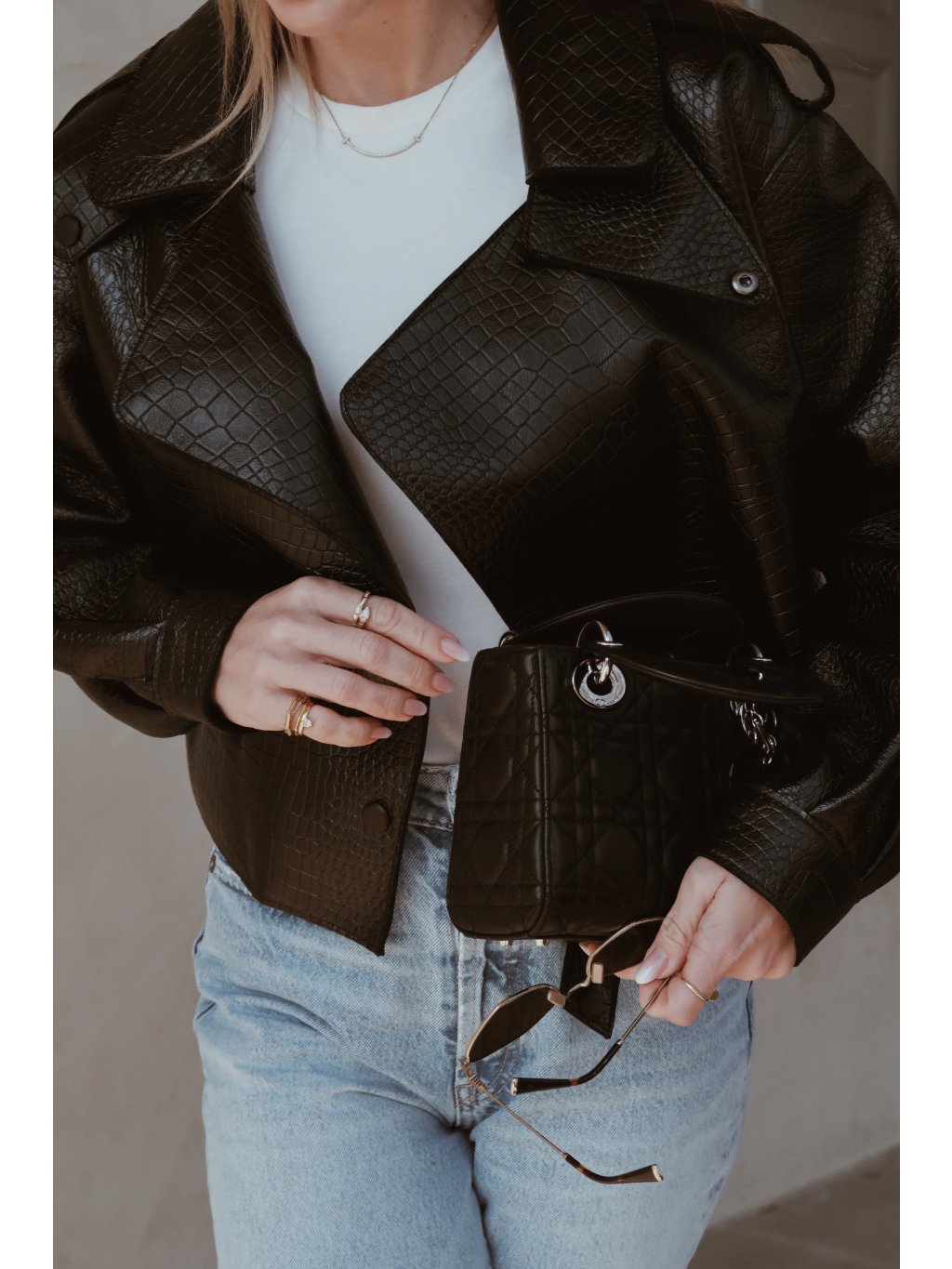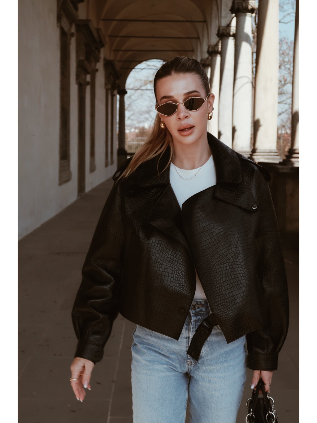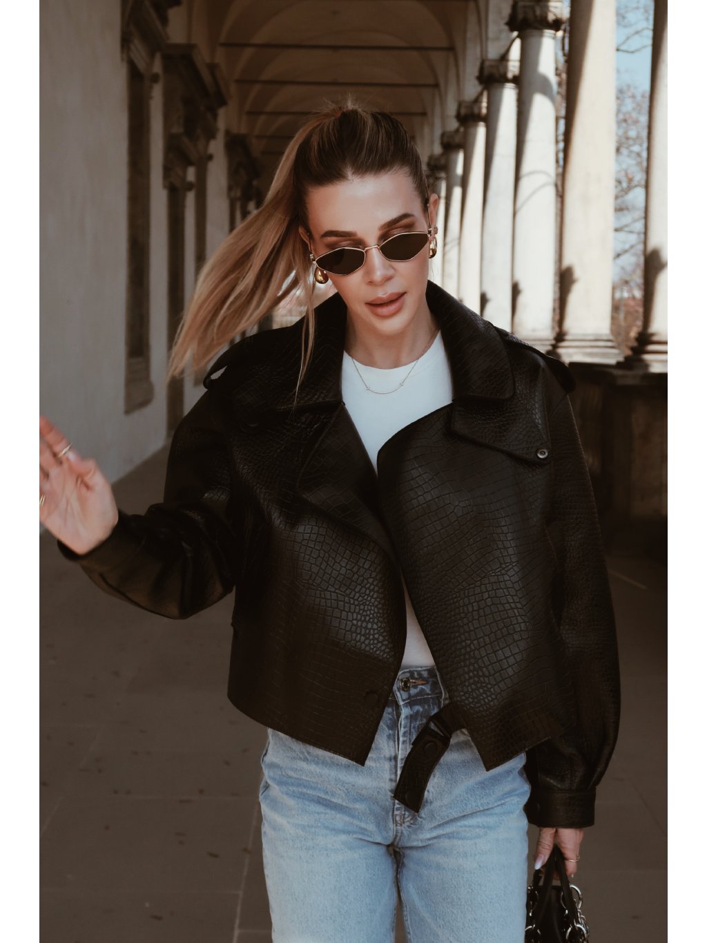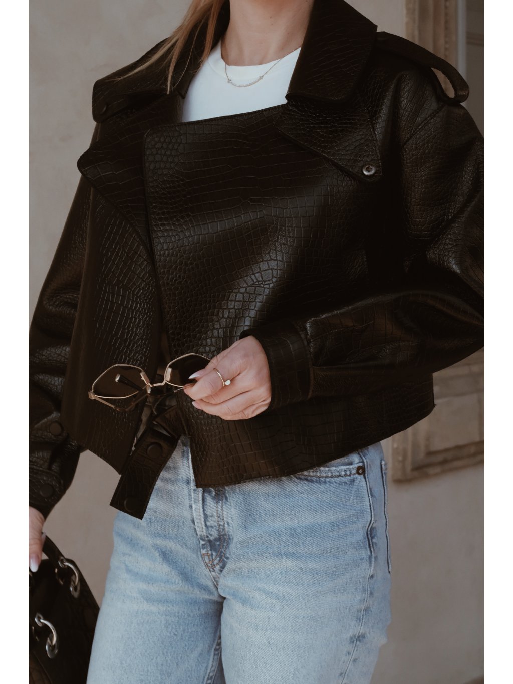 Stylová kožená dámská bunda v černé barvě s croco efektem