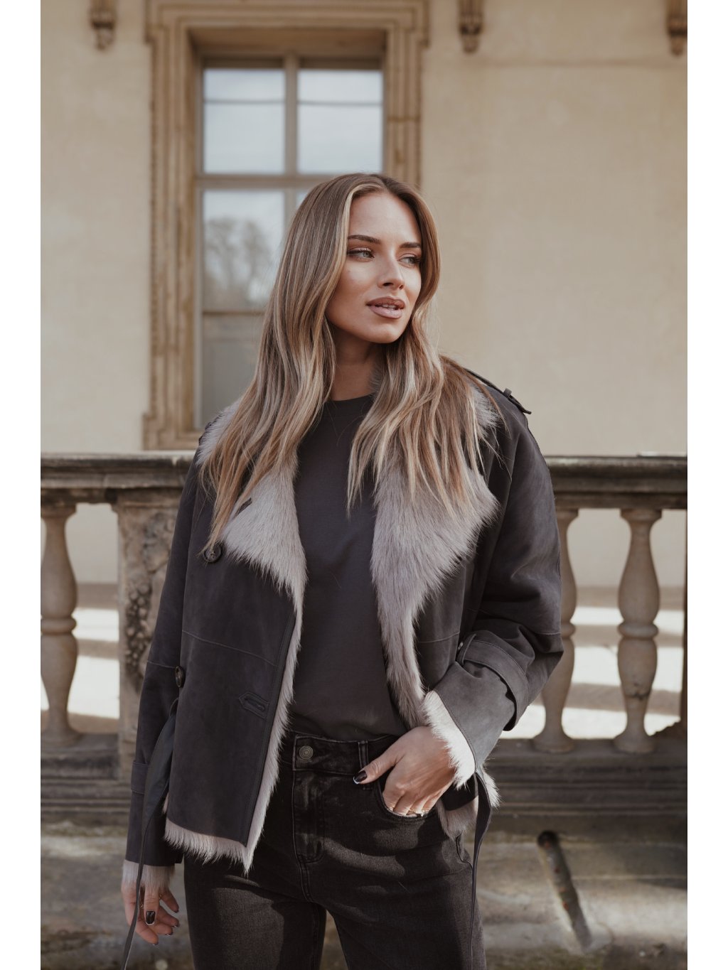 Matný povrch v tmavém odstínu v kontrastu se světlou kožešinou
