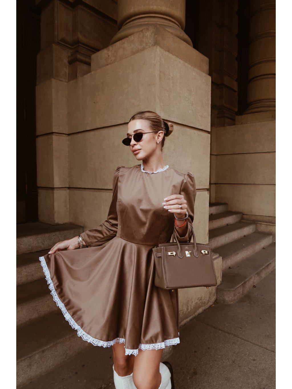 Mini dámské šaty z zlato bronzového sametu ozdobeny krajkou